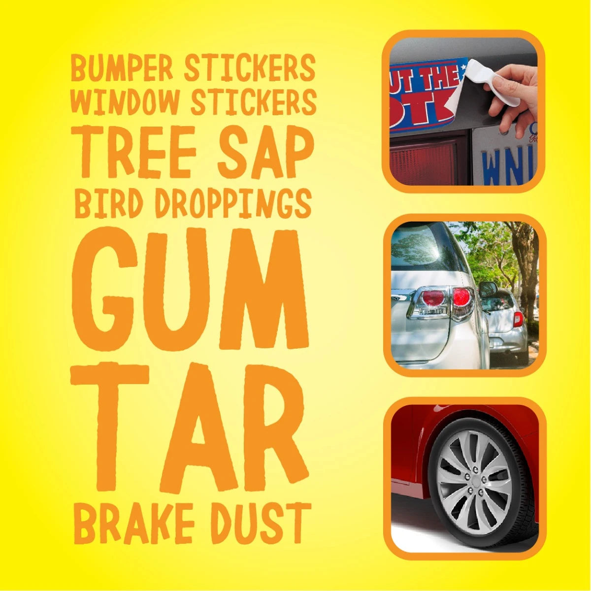 Works on bumper stickers, gum, bird droppings, tree sap, brake dust, asphalt